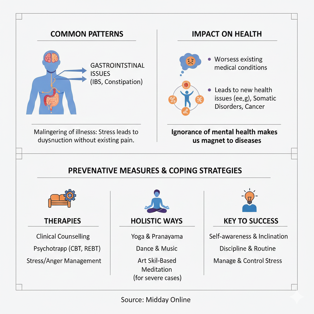 The mind and body are closely interconnected. The occurrence of mental stress can have various physiological effects on the body, leading to physical discomfort. This phenomenon is often referred to as the mind-body connection. When you experience mental stress, your body releases stress hormones like cortisol and adrenaline. These hormones can impact different systems within the body, leading to various physical manifestations.From thought to pain, stress has real manifestations in the form of physical pain. To unravel the invisible impact of mental stress on our bodies, Midday Online spoke to Mrs Rucha Shrikhande Divekar, consultant psychologist at Ruby Hall Clinic, Pune.